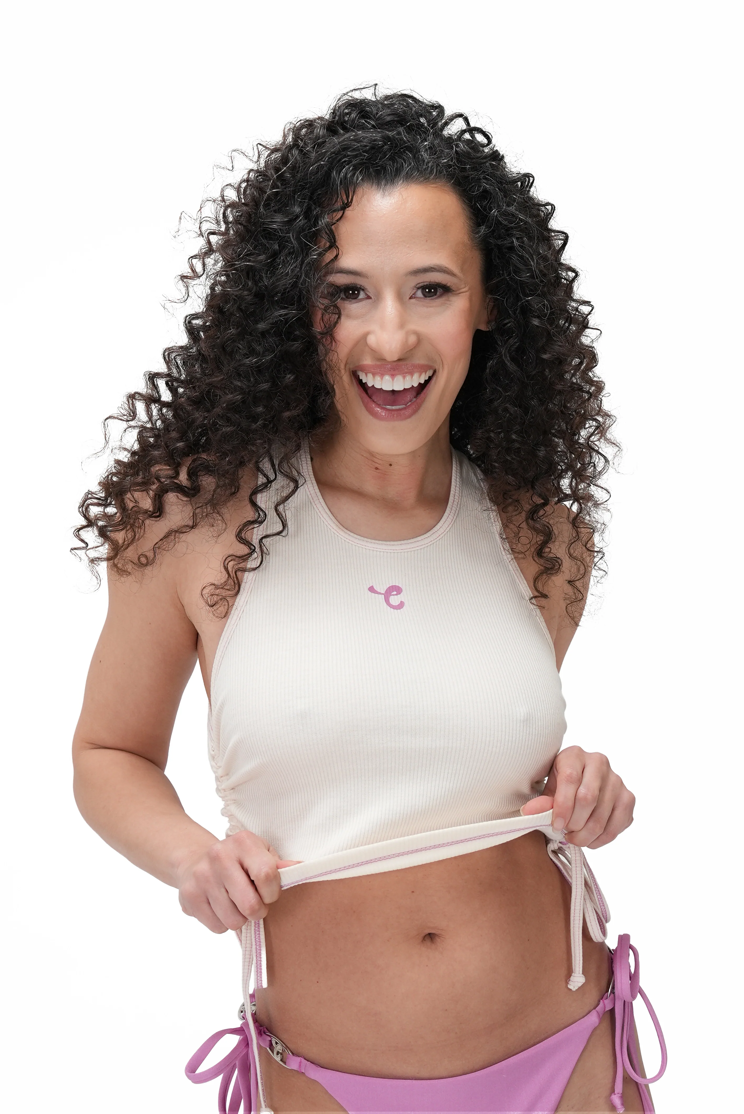 Stay cool and look cute with our Chaturbate ladiesā cropped tank top. Made exclusively for Chaturbateās summer collection, this soft knit cropped tank accentuates your figure even more with a racerback design, side-ruching, and bottom ties. Shown here in a chic cream color, this womenās tank features our signature āCā logo in pink with matching hem-stitch accents along the seams. For an easy casual look, throw it on over your Chaturbate bikini or pair with your favorite bottoms.